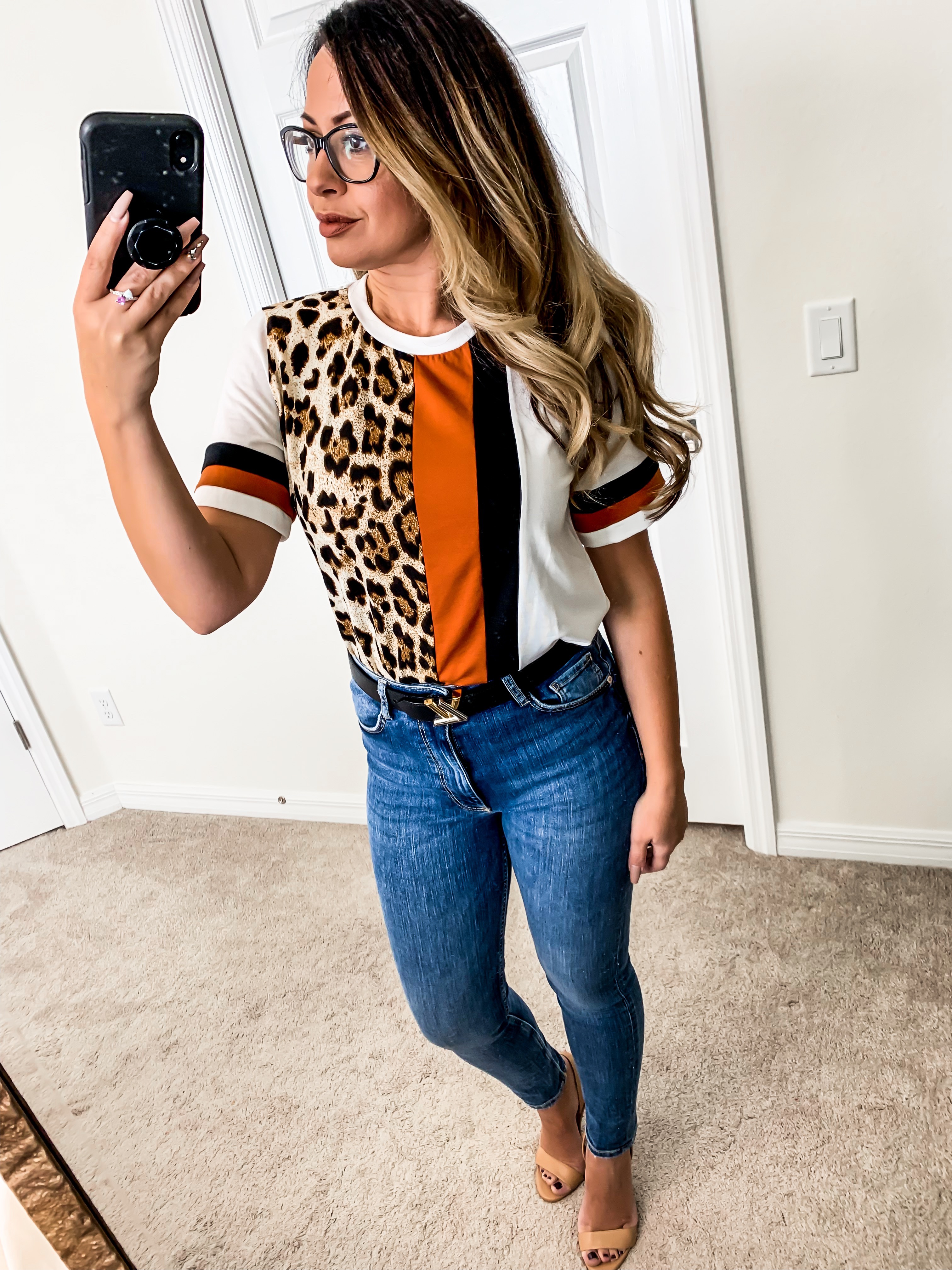 This cute color block leopard top comes in several color options! Leopard Orange Short Sleeve Shirt